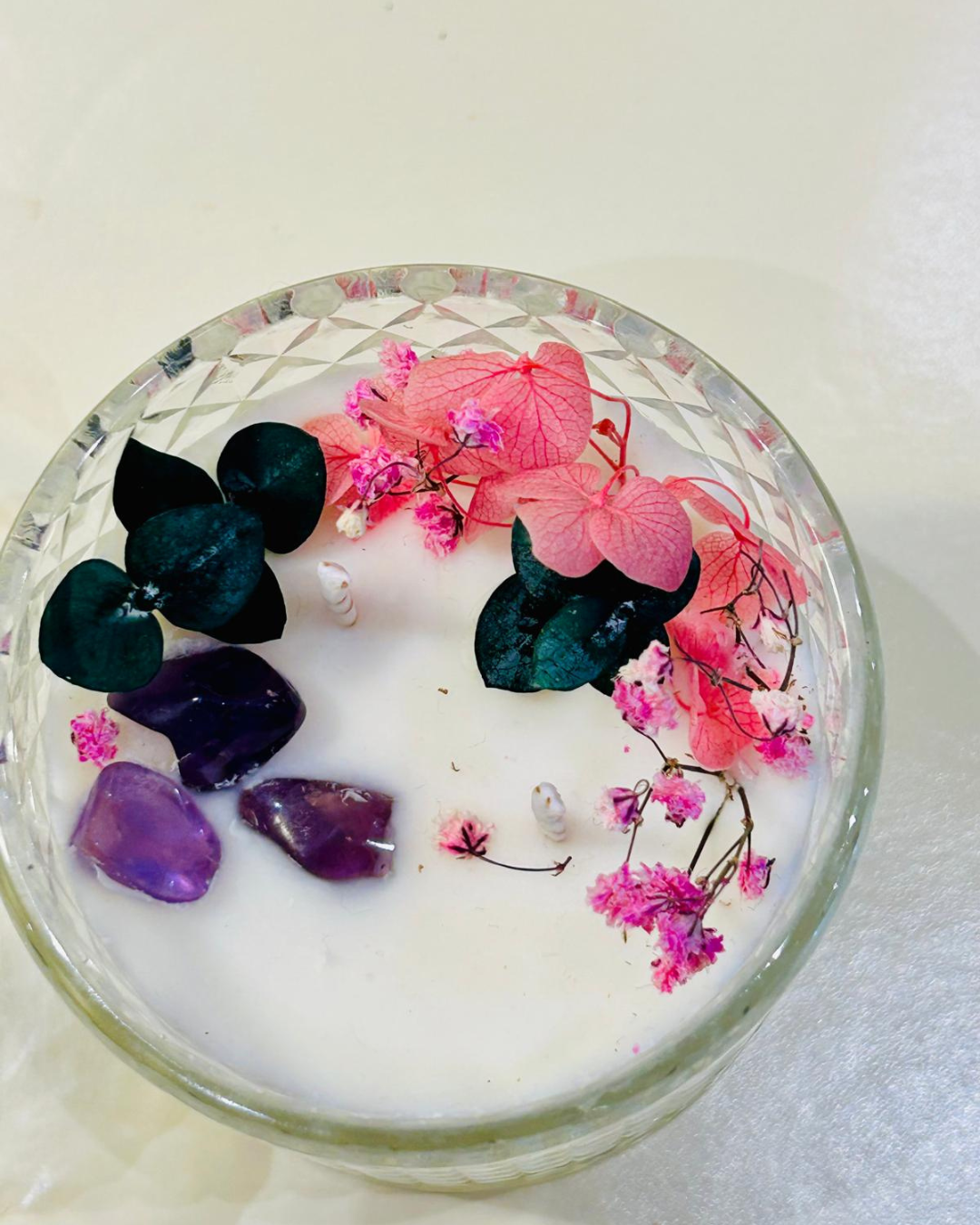 Su doble mecha de algodón orgánico garantiza una quema uniforme y duradera, mientras que su decoración botánica con ortensias y eucalipto baby preservados, acompañada de un mineral de amatista, convierte esta pieza en un objeto decorativo exclusivo, ideal para regalar o para darte un capricho que destaque por su estilo y buen gusto.