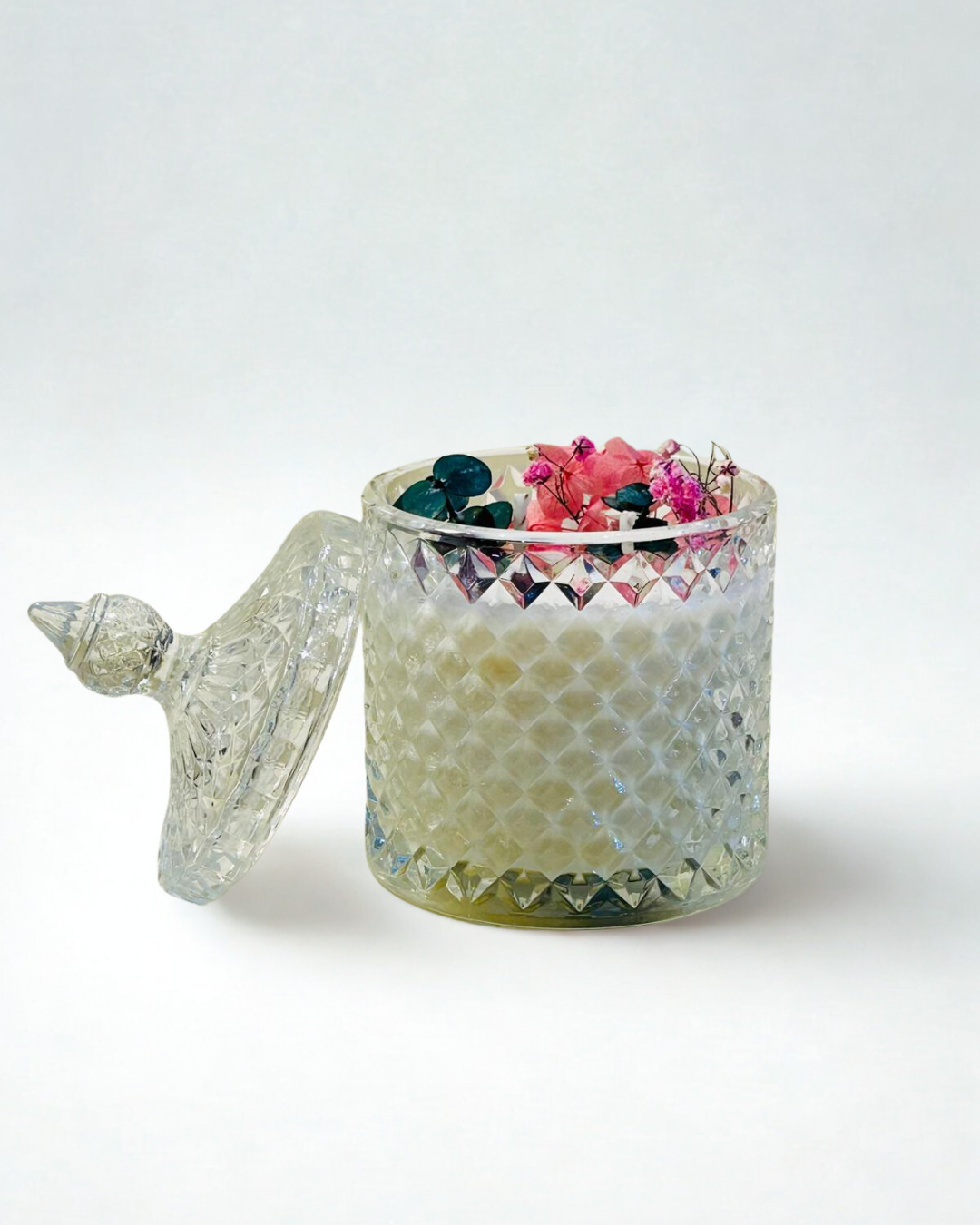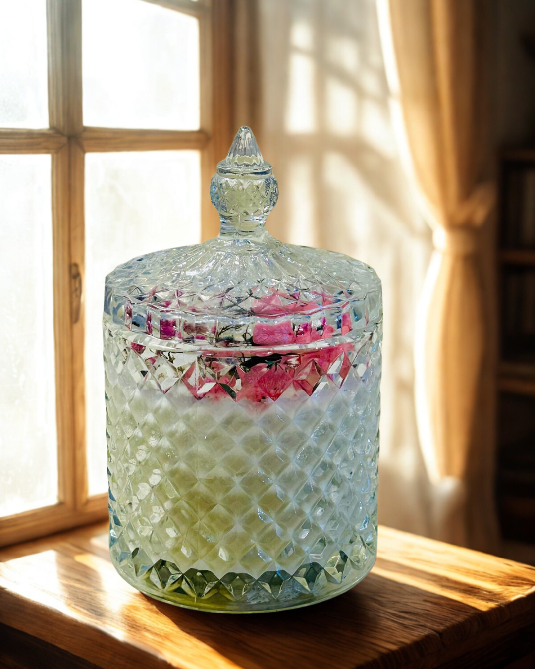 Descubre la combinación perfecta de lujo y delicadeza con nuestra bombonera de cristal tallado con tapa, un elemento único que transformará cualquier rincón de tu hogar. Cada vela contiene 225 g de cera de soja vegetal, aromatizada con un elegante bouquet de vainilla y rosas, pensado para envolver tus sentidos en un ambiente cálido y sofisticado.