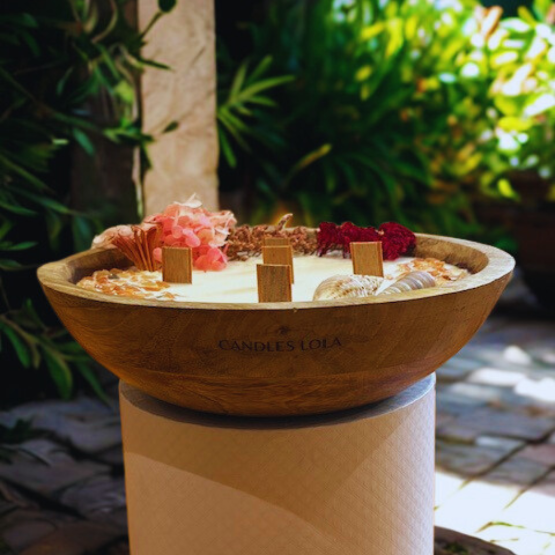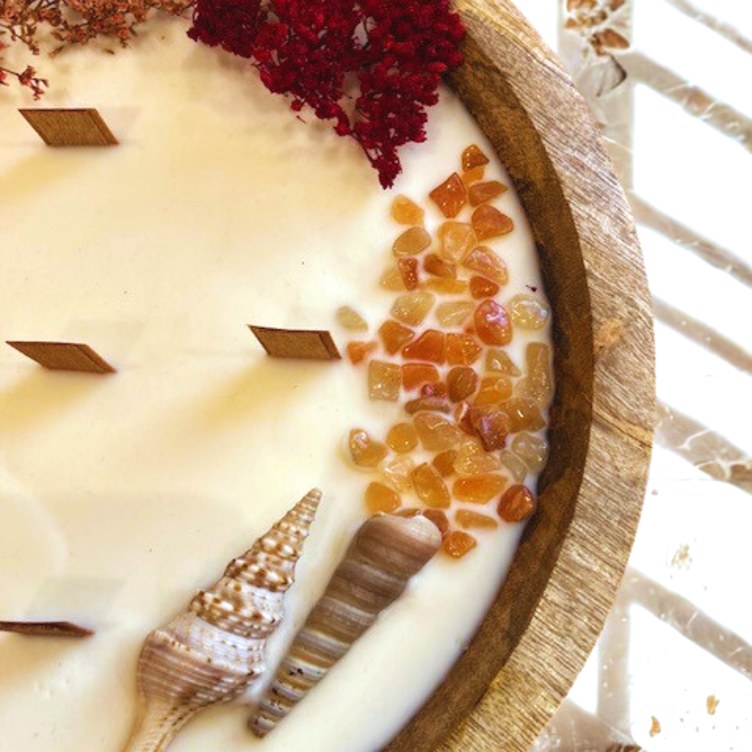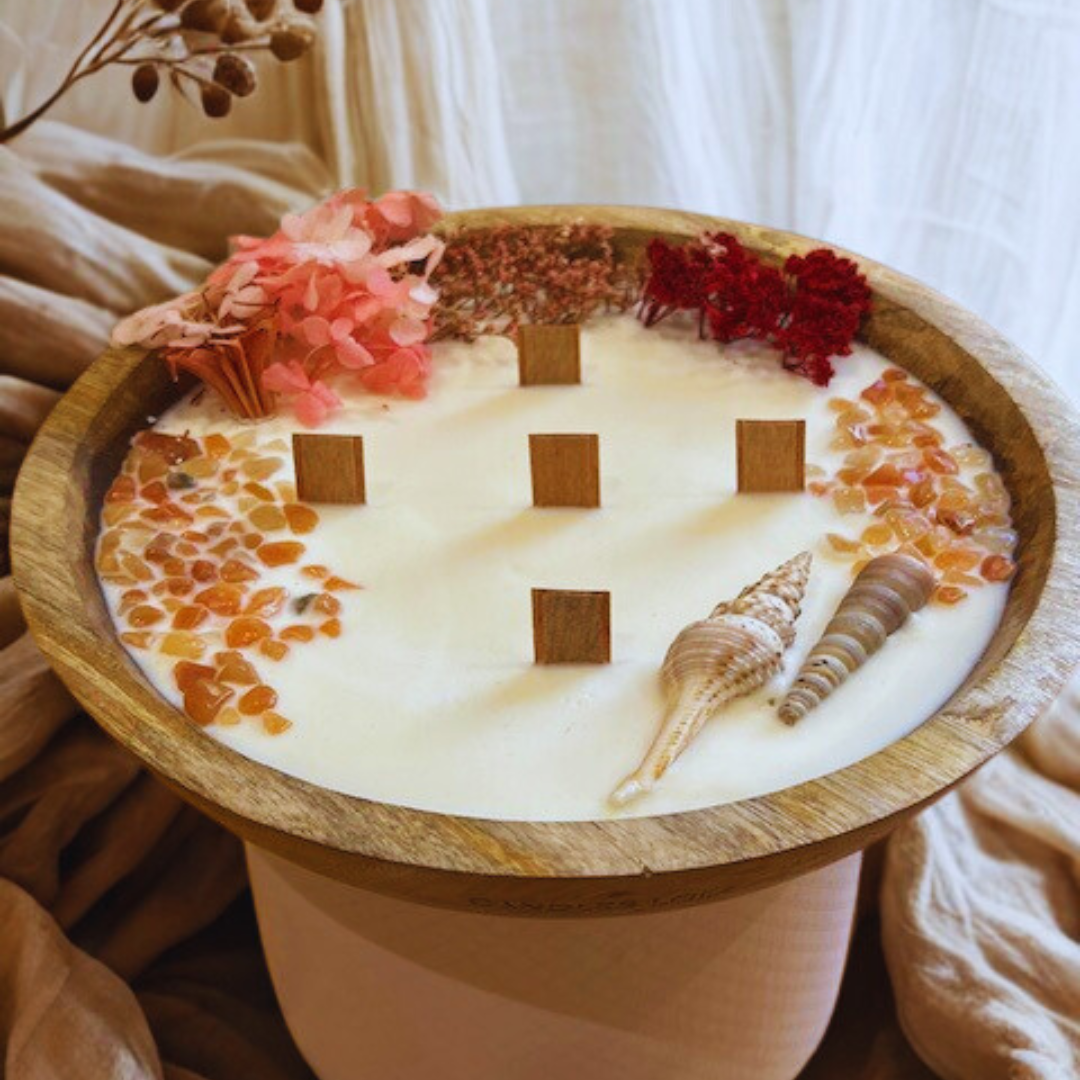Déjate llevar por la magia exótica de los mares del Sur con esta pieza única: un cuenco artesanal de madera natural, generosamente tallado y decorado con hortensias preservadas, conchas marinas, elementos botánicos y chips de ágata fuego. Un auténtico tributo a la belleza de la naturaleza salvaje y sagrada.