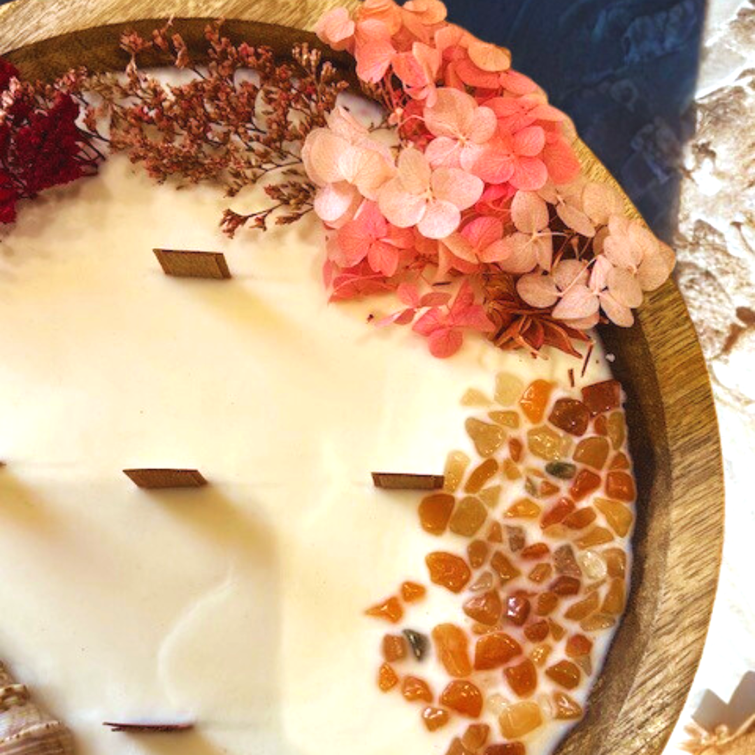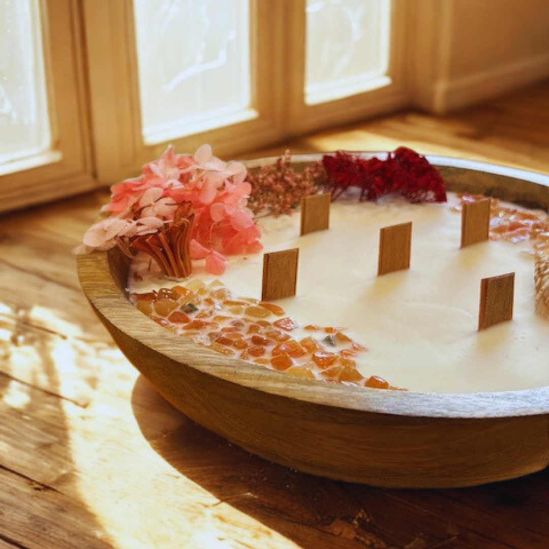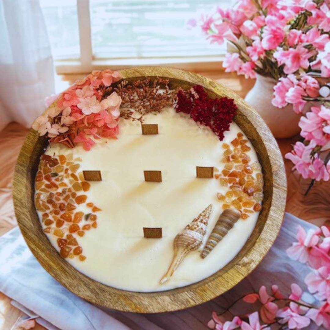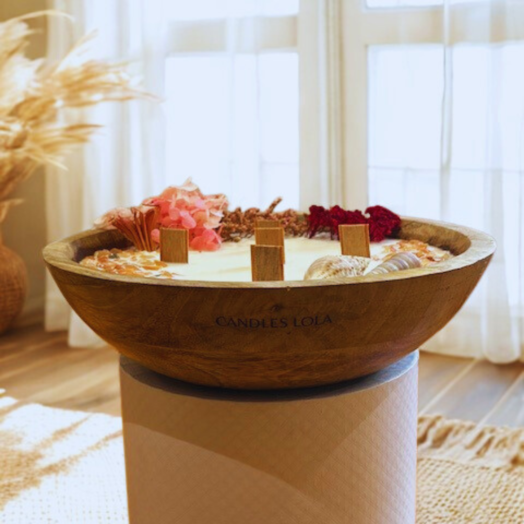 Déjate llevar por la magia exótica de los mares del Sur con esta pieza única: un cuenco artesanal de madera natural, generosamente tallado y decorado con hortensias preservadas, conchas marinas, elementos botánicos y chips de ágata fuego. Un auténtico tributo a la belleza de la naturaleza salvaje y sagrada.