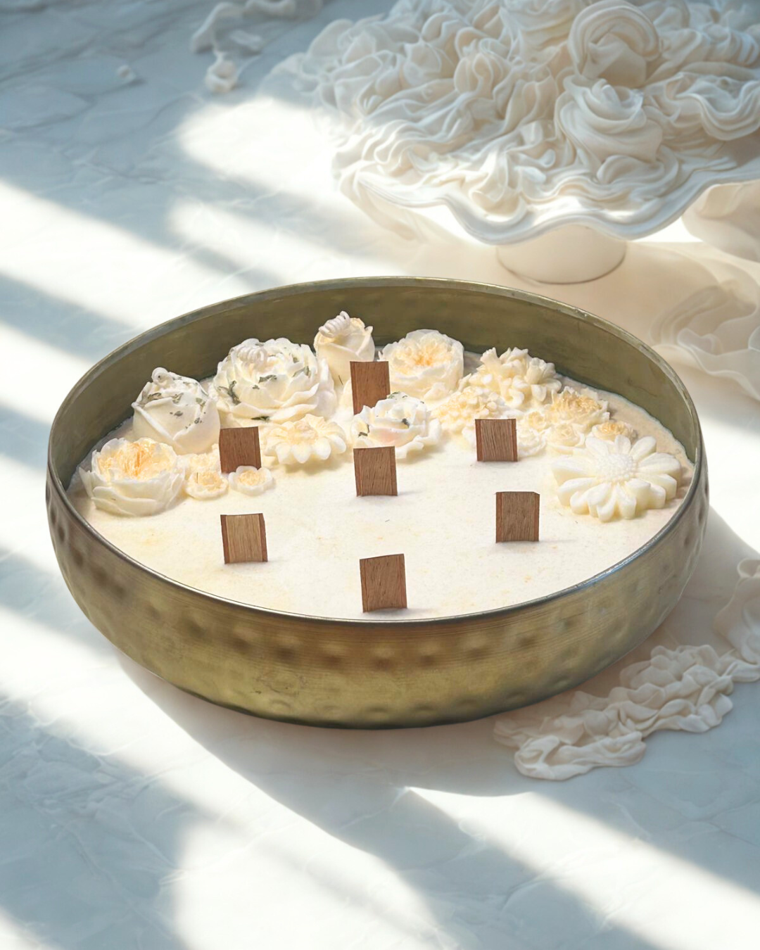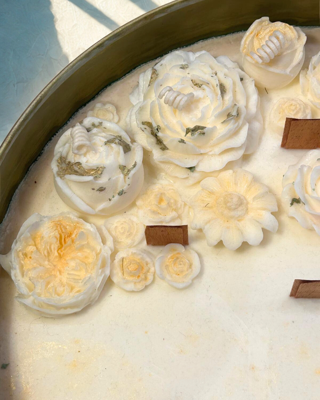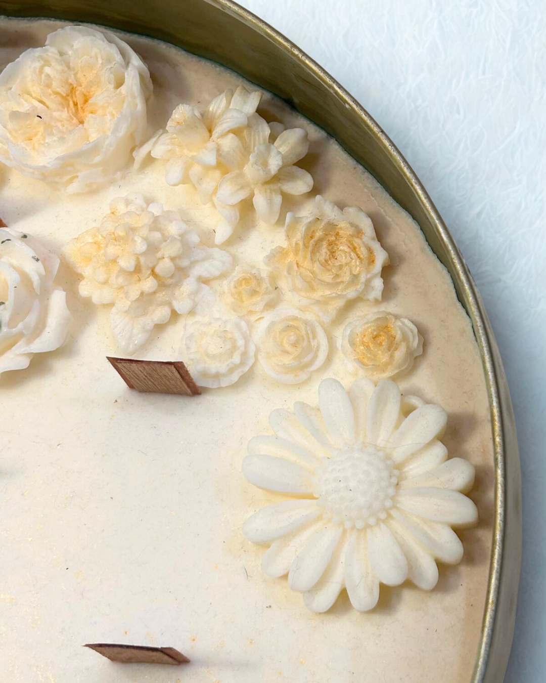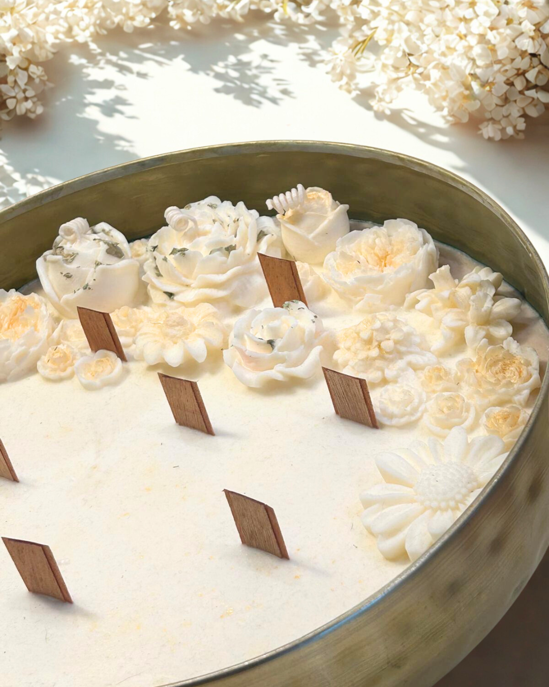 Decorada con delicadas flores de cera hechas a mano, con sutiles toques dorados que aportan luz y sofisticación, esta vela es una joya decorativa de diseño antiguo y elegante, ideal para embellecer tu hogar o acompañar celebraciones especiales. El metal de latón añade un encanto vintage que realza cualquier espacio.